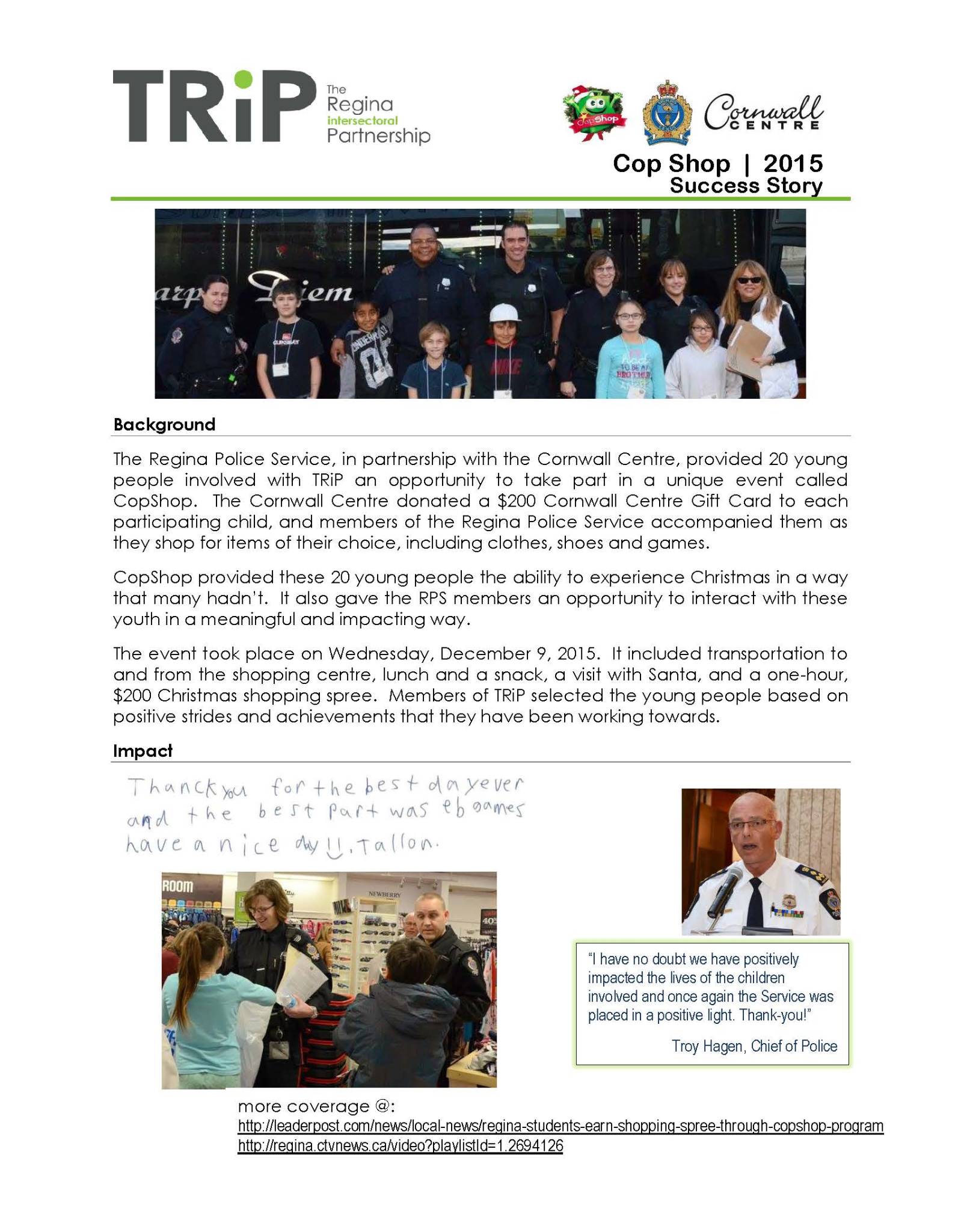 20 students from across Regina were chosen to be part of the program, and were paired up with an officer to do Christmas shopping.